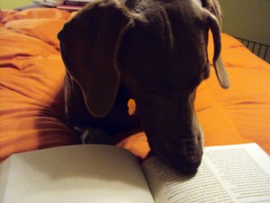 In Uncategorized on 02/17/2011 at 7:48 pmLast night it rained goose in the master bedroom. It all began with Olive standing in the middle of my bed inquisitively admiring her image in the dresser mirror. Ever so slightly cocking her aristocratic flannel grey head slightly to the left, then right, characterized by a subtle look of bemusement, adoration and surprise on her expressive face. Truly checking herself out as if she were a narcissistic Supermodel primping before making her entrance onto the (ugh) CATwalk. It was all very entertaining in its childlike innocence and simplicity. And then with the swiftness of a crazed cheetah and the skill of a seasoned neurologist, she drops her head and tears a hole in my massively stuffed burnt orange Siberian goose down comforter. The hole is fairly small, about 18-point and in the shape of an “L.” Almost unnoticeable. Until Olive drops down onto the bed like a house dropping onto a village of munchkins. Hundreds of white goose down feathers erupt from the comforter as though a sleeping Mount Vesuvius had been awakened. “SHIT,” I scream. “YOU CRAZY NUTHATCH! STOP MOVING! NOW!” Olive is now wearing tufts of feathers on her muzzle which make her look like a grizzled old geezer with a spotty beard. She does not hear me yelling because 1000% of her dog brain is focused on trying to eat all the feathers orbiting her. She misses more times than she gets one so all you hear is rapid fire “air snapping.” Her mouth opening and clamping shut repeatedly, stopping only to gag on a feather once in awhile. To complete this mental image, picture Olive racing around in all directions on the bed, frantically trying to catch all the feathers. I guess for her, this is the next best thing to getting the goose. Getting the goose down feathers. Do you have any idea how hard it is to find thread in burnt orange? Still, it was funny. I love my exuberant pooch.