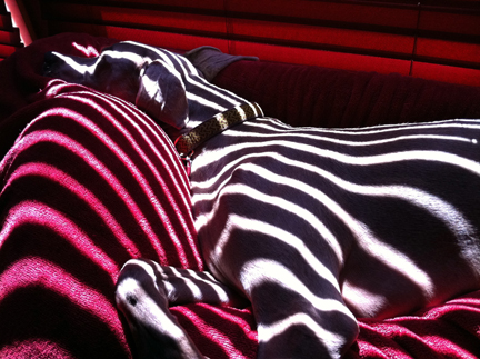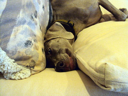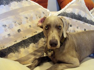 Last Monday night, I dropped Olive off at her Trainer’s in preparation for my out-of-town business trip the next morning. I am grateful that I can leave Olive in the hands of someone she knows and someone who knows how to handle dogs—even the most challenging. As Shelley and her daughter Amanda secure Olive in the crate in the back of their car, I feel the familiar separation anxiety (mine), which like an air biscuit in church, I try hard to suppress. Little did Olive know that she’d end up with a human companion who is actually much like herself. I try not to think about her as I drive home, focusing on navigating my way through the thick fog suspended above the roads like endless giant cottonballs, deciding that I should no longer take the long, winding, narrow, steep back roads at night ESPECIALLY when it’s so foggy out. I get home and turn on the documentary “Something’s Wrong with Aunt Diane” on HBO. It is both catastrophically sad, chilling and perplexing. I wonder what Olive is doing right now, I think. Every so often, I continue to think about Olive throughout the next three days at my business meeting. I really do miss her and hate being away from her. Yeah, I guess I’m head over heels in love with my goofy dog. I wait until early Wednesday evening to text Shelley: “IS OLIVE BEHAVING?” Zing. The reply? ‘NO, DID YOU GET MY EMAIL?” ‘NO, IS EVERYTHING OKAY?” Zing. I can’t even wait for the reply; I panic and immediately call Shelley who informs me that Olive barked non-stop from the time she got her home at 10pm Monday night until 4am on Tuesday morning. “SHE BARKS AT EVERYTHING,” says Shelley, ‘BUTTERFLIES, BIRDS, BEES, THE WIND, YOU NAME IT.” She barked so much in fact, that the three teenagers living in the house, vacated it in the middle of the night. And then I remembered. This house was new to Olive, and there were new people living there; it was now a more active environment that Shelley lived in. This kind of change is challenging to Weims who are always in a state of “high alert.” “THAT’S NEW, BARK BARK. THAT’S DIFFERENT, BARK BARK. WHAT’S THAT? BARK BARK. WHO ARE YOU? BARK BARK. WHAT’S GOING ON? BARK BARK. I felt sorry for everyone. No one in Shelley’s family got to sleep. And poor Olive was on guard duty all night in an unfamiliar house filled with new, unfamiliar faces. She probably felt overwhelmed by the challenge of trying to “manage” all the kinetic activity around her. She sure must have barked herself out because when she returned home, the first time she barked, it sounded funny; unlike her usual barrel-chested bark, it sounded somewhat strained. Like a fat opera singer with laryngitis. Pitiful. She also seemed a bit tranquil and tentative at the same time. Like someone who couldn’t decide if they were just exhausted or had post traumatic stress disorder. She marched straight into her Beverly Hills 90210 crate last night and went right to sleep. She even skipped jumping up on the bed to spend some time with me. Today, after our walk, Olive spent much of the day stretched out on top of the back of the couch, sunning herself in front of the South-facing windows like a grey panther in the Great Plains of Africa who has just finished a very satisfying wildlife meal. Back home. Back in her quiet environment. Back to her dinner mixed with sweet potatoes. Back to just having to watch one person. Back to being herself. Right now, she’s in the dining room, zonked out on the pony-print chair, head resting on its arm, snoring ever so lightly. Peace at last. For all.