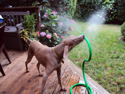 In dogs, humor, pets, weimaraners, writing on 07/07/2011 at 3:36 pmOlive, a pro at looking as innocent as an infant fawn when she most needs to, thoroughly enjoyed the Fourth of July celebration at my cousin’s house. With her characteristic grace and wit, she stretched her Audrey Hepburn-like neck across the picnic table and extended her bright pink tongue as far as it could possibly reach to lick the icing off the cupcakes, nose through the macaroni salad, and nip at the hot dogs. Clearly the dog prefers dessert as more than once she had to be forcibly extricated from either the Friendly’s Orange Crème ice cream and sherbet roll, the black and white homemade cupcakes with edible 3D red and blue “firework” bolts standing atop each or the dutch chocolate ice cream log. She never got much before I’d hear someone shriek, “OLIVE, NO!” And then someone would have to scrape the icing off the cupcakes because I ask you, who wants to eat dog nose prints? Olive’s ears recoil as she starts to back away from the scene of the delicious crime. Smacking her lips, I can see the glint of delight lighting her eyes. ‘YEAH, THAT WAS DEFINITELY WORTH IT,” thinks a gleeful Olive. “FOR GOD’S SAKE OLIVE, DO WE STICK OUR NOSE AND TONGUES INTO YOUR FOOD BOWL?” Olive looks up at me as though she has no idea what I’m talking about. And then she abruptly takes off. You’d think she just recalled where she left her garter belt on Saturday night. Instead, she decides that this seems like an opportune time to chase Hunter, the 120 pound Golden Retriever and Oliver the tiny Tibetan Terrorist around the small yard. The three dogs begin chasing each other, racing in circles so swiftly that it appears that the circle is unbroken and that each of the dogs is a charm on a sterling silver bracelet. Green grass flies in all directions as they momentarily lose traction circling a bewildered bush, sometimes slipping but rebounding so quickly that the fall is almost imperceptible. Oliver is chasing Hunter who is chasing Olive, who lives to be chased. They are moving so speedily that I fear the centrifugal force will jettison them one by one into outer space. And just as quickly as it started, it stops. Olive now turns her attention to the oscillating fan, approaching it inquisitively. She plants her face directly in the fan’s wind pattern and she stands there letting it cool her off. What a goofy dog. After all the less ambulatory guests leave, we bring out the “spray mister” which looks like a garden hose that has been fashioned out of tough green plastic piping and stands up like a cobra snake ready to spit. (Perhaps this was not an accident in the design.) We connect the garden hose to it and it starts spraying a seductive fine mist in three different directions. Olive runs over to the spray mister like she’s late to prom. She’s not quite sure how to approach it, as it envelops her in its petite moist clouds. First, she tries biting the clouds to great comical effect. Because she’s biting very daintily and not snapping her mouth closed each time, it looks like she’s trying to gum the clouds to death. Not satisfied with her intake, she decides to take the proverbial bull by the horns and chew on the tiny golden spouts releasing the moisture. I don’t think she realizes that as she is imbibing the “liquid clouds” that her entire head and face is slowly getting soaked. The irony is not lost on me. I should have used this as an opportunity to bathe my little monochromatic monkey.