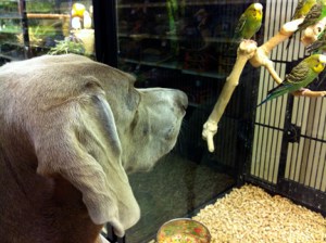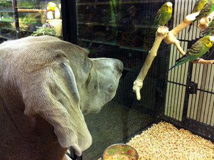 In dogs, humor, pets, weimaraners, writing on 07/19/2011 at 8:53 pmAs many times as Olive and I have been meandering the aisles of the local pet superstore, it never occurred to me to bring her down the “Bird Aisle” to see her reaction. Probably because we don’t even make it five feet inside the door and people are fawning all over Olive. And then I usually have to keep children from molesting her. In their excitement, they begin groping her as though she is the canine incarnation of Justin Bieber. Olive takes it all in stride, happy just to have a crowd of tiny humans orbiting her universe. We check out the treats aisle and I consider buying Greenies because I’m sure Olive would love sharpening her pearly whites on them but then I remember how Idgy vomited up huge chunks of them and move on. As we make our way down the toy aisle, Olive goes into olfactory overdrive and starts nosing through the toys nearest to the floor, occasionally picking something up and trying to make a run for it like she’s just pilfered a piece of blueberry pie from a diner and the cook is chasing her down the street. This time, the proverbial light bulb materializes above my head and I say, “OLIVE. HOW WOULD YOU LIKE TO SEE SOME BIRDSSSSSS?” She immediately snaps to attention like an Airforce cadet and fixes an intense gaze on me. “I TAKE THAT AS A YES.” We approach the dozens of parakeets (all green for some reason; maybe they are cheaper in bulk colors) encased in their acrylic aviary and Olive’s reaction is priceless. She appears to be stunned. Shocked that so many birds are in such close proximity to her. I can’t decide whether she is counting them or calculating their caloric value. She watches them flitter about for a few seconds before jumping up and raking her big paws down the front of the acrylic window, whining ever so slightly. “ARE THESE LIME FLAVORED?” Olive wonders. I wonder if I’m being a little cruel, but this is too funny. The birds don’t seem to give a shit; they seem completely nonplussed by the sight of this giant grey monster staring at them and then jumping up against the front of their “house.” Olive, not surprisingly, doesn’t want to leave. “LET’S GO OLIVE BEFORE WE GET BUSTED FOR PARAKEET HARASSMENT.”