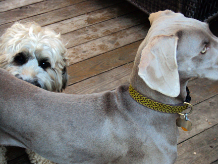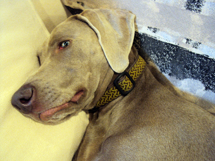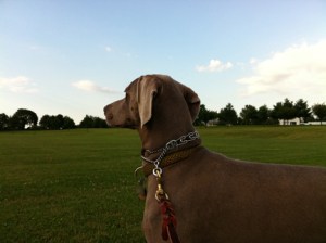 In dogs, humor, pets, weimaraners, writing on 07/08/2011 at 7:58 amThis morning, as raindrops faintly fell, Olive and I stood in the middle of the lawn just admiring the view. The corn in the field across the street is more than knee-high already. All the fields belonging to the local farmer provide a wide and long field of view, making this patch of land resemble what I imagine the cornfields of Iowa might look like. The sky is streaked with grey-blue tones, a scattered cloud cover and a glint of orange where the sun is beginning to rise. A brand new day is beginning. With this peaceful scene as a backdrop, I suddenly wonder what life would be like if we were all dogs. If we were all dogs, we wouldn’t care what color other dogs were. We’d spend our days blissfully present in the joy of simply being alive. If we were all dogs, our lives would be much shorter, and we’d be oblivious to what the future might hold or what pains the past has wrought. As dogs, others would know exactly where they stood with us. One sniff of the rump and everything about who we are would be read with an elegant simplicity that defies today’s most advanced technology. There would be no masks, no games, nowhere to hide our true selves. We’d have our disagreements, but they’d be sorted out without using guns and knives; without belittling or shaming others. We might growl and snarl; we’d bark; we might even bite, but usually out of an instinct for self-preservation, not malice. If we were dogs, we’d take immense joy in the smallest moments of our lives. Whether it’s eating our food, chasing a ball, or lying idly on the lawn on a hot Summer day. We’d greet others with a wag of our tail, a bounce in our step, and great anticipation about making new friends. If we were dogs, we’d roam our surroundings far and wide, learning as we go along in what would always feel like a great adventure. We wouldn’t care how old the other dogs were, what breeds they were, or whether they were male or female. As long as they functioned within the order of the pack, all would be accepted. If we were dogs, we’d already have the kind of loving, peaceful spirits that many people take a lifetime to attain. We’d be happy just “to be.” If we were dogs even for just a day, we’d be better people. Thanks Olive, for making me a little bit of a better person, every day.