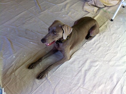 In dogs, humor, lifestyle, pets, weimaraners, writing on 09/01/2011 at 10:57 amOlive’s been a really good sport about the kitchen renovation taking place. She doesn’t seem to mind that her water and food bowls have been unceremoniously moved into the basement. Or that she can no longer stand in front of the dining room window and people-and-car-watch. And bark. Of course, I knew better than to dare move Olive’s overstuffed black-and-white pony chair from the corner of the dining room. That would be akin to shoving Queen Elizabeth’s throne out a window. There she sat, as regal-looking as ever in her chair surrounded by almost two dozen giant cardboard boxes protecting kitchen cabinets and other nicely finished “sticks.” It was comical. There was just enough room for the chair and her. It created the impression that Queen Olive was surrounded by a crowd of loyal subjects. And while she enjoyed snacking on all the bits and pieces of chalky drywall, splinters of wood, splatters of spackle, and yes, cardboard boxes, she wasn’t too crazy about all the strange people entering and leaving the house. Oh sure, she’d bark her little grey head off when they entered the house, but in a dramatic display of ambivalance, her tiny tail wagged back and forth so fast, I was afraid it would snap off at its base like the stem on an aging pumpkin. One unfortunate result of all this intermittent commotion was the toll it took on Olive’s bowels. I’m now convinced that when she gets stressed, she goes through minor bouts of IBS (Irritable Bowel Syndrome for those of you with non-irritable bowels). This causes her to bark insistently at between 2am and 4am to be let out. Although I consider myself a morning person, this is not my favorite time of day to get up, get dressed and go outside. I stand under the star-kissed moonlight in the front yard with my dog who in the universally undignified “pooping position,” lets the contents of her bowels fly.