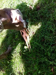 In dogs, humor, lifestyle, pets, weimaraners, writing on 09/13/2011 at 9:44 pmIt happens every day. On our walks, Olive and I are inevitably greeted by a passing pedigree-ignorant stranger with, “Is that a Greyhound?” By now, after encountering 18-months of this, I probably either scowl or chuckle without realizing it. “Actually, she’s a Weimaraner. German. A hunting dog. Go ahead, lay down on the sidewalk and she’ll bring you over to me in her mouth.” I never verbalize the last part, I just think it. I used to think that the reason why Olive gets mis-identified as a Greyhound is because she is grey and she’s a hound. But I’ve come to realize that it’s more complex than that. One of my friends pointed out that it might be because Olive is so tall. Even when she’s not in her Jimmy Choos. I also think it’s because Olive has a deep barrel chest, well developed “brisket,” AND a very high “tuck up.” In non-dog and non-medical terms, it is an elegant, accentuated upward slope of her undercarriage. I can’t believe it’s taken me this long to so eloquently articulate this. (Heavy sarcasm) “OLIVE. GET OVER HERE. I NEED TO CHECK YOUR UNDERCARRIAGE.” “NO WAY. YOU JUST WANT TO COUNT MY NIPPLES AGAIN.” She’s right. I have been obsessed with this ever since I realized that dogs have only 10 nipples. (I can’t believe I just said ‘only.’) What is the significance of this? It means that Olive’s mother Lacy, who had a litter of 11, was one nipple short. And to this day, I’m convinced that Olive was the pup shortchanged by this genetic fact. Why do I think this? Because my dog will spot a nipple of any kind from as far away as Neptune. Any kind of nipple. The nipple on a baby bottle. On a balloon. On an exercise ball. On a tire. On a swim tube. Poor Olive, always chasing the eternally missing nipple.