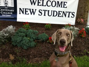 In dogs, humor, lifestyle, pets, weimaraners, writing on 09/14/2011 at 8:42 pmIt’s back to school time and Olive is as thrilled as an unopened jar of fingerpaint. During our morning walk, we pass by the local middle school and Centenary College. This gives Olive two opportunities to seek out oohs, aahs and friendly groping by both small and tall humans. As we approach the red brick entrance to the quintessential 1950s America-style Middle School, first we encounter the crossing guard who will walk into the middle of the street to stop oncoming traffic to allow Olive to pass safely as though she is another child. Olive stops to offer a thank-you lick. Up ahead to the right, all the children have gathered, chatting noisily in small groups like bees at a summer picnic. Sometimes a parent or a teacher will stop to chat and pet Olive. Some of the children stare longingly at Olive, their desire to pet her palpable. But, most are engaged in important conversations about all the things that were important to us at that age. You know, the things we can’t even recall today. We continue walking, passing mostly Victorian-style homes. The morning air is punctuated by the sounds of dogs barking from all directions, cars passing by, cement workers demolishing rapidly deteriorating stone front steps and often, the bell at Centenary College tolling seven times to let us know that it’s seven o’clock. We pass the home of the hyperactive tiny dog that rushes out to the front porch of its unique octagonal home (once the local post office) to bark non-stop crazy at Olive. Olive ignored it for many months and then got sick of it. Now, I watch for the exact moment when the hair on her neck and back rises and she utters a low growl that I’m sure means “SHUT THE F UP YOU BATSHIT DOG.” Inevitably we hear batshit’s owner yell at him and he stops. A few more blocks and we pass the “dancing teacup,” the miniature black and tan Doberman Pinscher, who tethered to his porch, races out toward Olive on the sidewalk, barking like someone just lit his tail on fire. We’re not done yet. Another few blocks and we pass “The Crazy Westie,” the white West Highland Terrier who hurls himself at the windows of his house while barking at Olive. What is it with these tiny dogs and their obsessive barking? As we round the corner, we can see the gleaming gold dome atop Centenary College. Sometimes we stop to rest on the front lawn of the campus. I check my iphone while Olive lays next to me gnawing on a branch she’s found. After a few minutes, we rise, and Olive quickly focuses on the students crossing campus on their way to classes. Yesterday, one of the students hangs out his car window to ask me: “I HEAR THOSE DOGS ARE GASSY. IS THAT TRUE?” “ONLY AFTER SHE’S HAD A FEW BEERS, AND PUKED UP CHEETOS ON HERSELF WHILE WATCHING A FOOTBALL GAME,” I reply. That’s what I want to say. Instead I say, “Not really, but sometimes her stools are really loose.” Have a nice breakfast, I think.