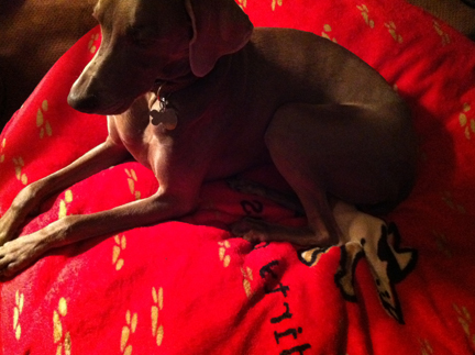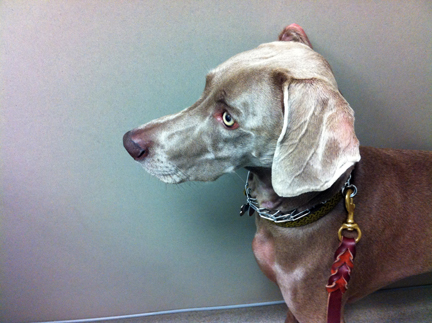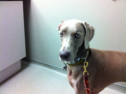 In dogs, humor, lifestyle, pets, weimaraners, writing on 10/02/2011 at 7:47 pmWhere do I even begin? The past three days have been nothing but chaos. Chaos executed with the imbecilic skill of the Marx Brothers. At 8:30 on Tuesday evening, I notice something odd on Olive’s back leg. “WHAT THE HELL?” I think. A cluster of raised bumps, about eight of them right above her “ankle.” I squint my astigmatic eyes and position them about a micron from the offending bumps. I find more running along the inside of her front legs and a few dotting her chest which are beginning to bloom. “HOLY SHIT.” My left brain senses that this is an allergic reaction of some kind. But of course, my irrational right hemisphere is conjuring up all sorts of insane possibilities. I call the Newton Veterinary Hospital who asks me if I “want” to bring her in. That’s like saying, “How much money do you feel like spending tonight?” We agree that if it gets worse and travels to her face and neck, then I have to bring her in because it could affect her breathing. I go back to watching TV, going over to check Olive about every 10 minutes. She is resting comfortably, all curled up on her brown faux suede “UFO,” the bean bag chair she booted me from and claimed as her own. At 10:30, I check on her and it’s clear that it’s only getting worse. Her chest is now covered with a ton of irregularly-shaped pink polka dots. And now there are four bumps on her head. I look at Olive and announce with barely controlled panic, “GET UP. WE’RE GOING FOR A RIDE.” And so the drama begins with a 40-minute ride at night, in the rain, on dark country roads with a driver who has trouble recognizing faces across the room. With her glasses on. In the light. I look in my rearview mirror at Olive sitting in the back seat and mutter, “CHRIST. I HOPE I DON’T KILL US BOTH OLIVE.” We pull up to the veterinary hospital and walk inside. Unlike human emergency centers, this one is empty, save just a mother and her 10 year-old son and their pug. Olive gets weighed and then a thermometer is unceremoniously inserted into her butt (never a dog’s favorite; actually never anyone’s favorite.) The Veterinarian inspects Olive and confirms that she has a moderate case of hives. We discuss what might have caused this. My best guess is that earlier in the day when I took her out to pee, she dragged me to the tree in the front yard, tracking some impressive scent and then dropped to all fours and began rubbing herself on it. (Which after talking to my next door neighbor later on, deduce that it was likely fox urine that she rubbed herself in.) I yanked her up right away but apparently the damage was done. I love when people dispense what they perceive as helpful advice such as “You shouldn’t let your dog do that.” Gee, thanks. That’s like saying, “When you see someone pull the trigger, duck.” Genius. Unfortunately, I’m not a psychic. If I could actually read the minds of dogs (never mind humans), I wouldn’t be writing this blog. I’d be taking a bath in a tub filled with gold. The Vet whisks Olive into the treatment area/emergency room, in which I’m not allowed, to give her two injections: steroids and Benedryl, or the canine equivalent of Benedryl. I hate when they do this. I wish I could be with Olive, but I suppose it’s for the best. About 10 minutes later, Olive prances out into the waiting room. She’s got a white cotton gauze bandage on her leg. I’m instructed to stick around for another 20-30 minutes to make sure she doesn’t have an allergic reaction (déjà vu) to the injections. It’s now about 11:30pm. We walk around checking out the store section and I get a soda. Olive is just happy to be with me and away from needles. She doesn’t have a reaction so I settle up the bill ($219) and we leave. Now I have to find a 24-hour drugstore that sells Benadryl so I can have this on hand in case the hives return. Oh, and when I get home, I have to give Olive a “warm, oatmeal bath.” Olive usually starts nodding out between 8:30 and 9pm, and its now almost 2am. She has more energy yet than I would have imagined. Bath done. Then I shower. Set my alarm for 6am to make a 9am Doctor appointment about 90 minutes away. To be continued…