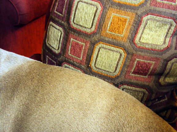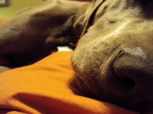 In dogs, humor, lifestyle, pets, weimaraners, writing on 10/27/2011 at 10:59 amThis is how I refer to Olive’s whiskers; as “bristlers,” because they are so stiff and prickly that they poke right through my slacks when she lays her head across my lap. Each has the tensile strength of a suspension cable on the George Washington Bridge. (They look deceptively thin and gentle in the photo.) “OUCH! HOLY CHRIST, OLIVE, HAVE YOU BEEN SHARPENING YOUR WHISKERS? I THINK I’M BLEEDING.” Not really, but my lap begins to feel like a pin cushion when she tries to burrow deeper into it like she’s flushing a fox out of a dark den. The first time this happened, I wondered if a Weim’s whiskers were any different than other dogs. I didn’t remember being “pincushioned” by Idgy’s whiskers. Or should I say, vibrissae, which I just learned is what a dog’s whiskers are really called. They are described as “finely tuned sensory structures,” and “while the hairs themselves don’t contain nerve endings, their base is surrounded by erectile tissue and a rich nerve supply.” This sounds like the set-up for a dirty joke, doesn’t it? And then there’s the extra sharpshooting whiskers, two on each side of Olive’s face poking out of the center of moles. I guess these help her navigate her way down the dark hallway while she’s tracking the scent of a micron of day-old food that’s been crushed deep into the nylon fibers of the carpet. So, if the vibrissae are so sensitive, I wonder what it feels like when dogs play with other dogs, mixing it up and “whiskering” each other. I’m guessing it feels pretty good. What do you have to say about this subject Olive? ‘BE QUIET, I’M PLAYING WITH MY WHISKERS.”