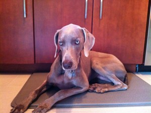 In dogs, humor, lifestyle, pets, weimaraners, writing on 10/08/2011 at 6:57 pmIf only I had had some tiny board game clue that the day before was only the beginning of a marathon that I didn’t recall signing up for. I awaken and squint my legally blind eyes to try to decipher the Buick-sized digital display on the clock. 7:08am. Thanks you idiot alarm clock. You have just one job to do and you’ve failed to do it. I check the alarm and it is indeed set for 6am. I guess it’s sleeping in today. I change out of my pajamas into clothes faster than Clark Kent turning into Superman. No shower needed as I took one just four hours ago. I grab Olive, run down the stairs, open the garage door and am confronted by torrential sheets of rain. It is worse than when Hurricane Irene came through. Olive looks at me. There is a giant question mark over her head. Simultaneously as this symbol symbolically appears, Olive takes a few steps backward. “ARE YOU INSANE? I’M NOT GOING OUT IN THIS.” she says. I look at her apologetically as I grab my pool blue umbrella and lead her outside. I watch the water pooling all over the front yard. The road in front of the house is already under four inches of water. So this is what they mean by “flash flooding,” I intuit. For once, Olive empties her biological waste tanks quickly as though someone whispered in her ear that there was a sale at Nordstrom’s she didn’t want to miss. I crate her, jump in my car and off I go accompanied by a persistent feeling of a fait accompli. “There’s no way I’m making this appointment today.” I think. “It’s only going to get worse as I travel East.” Sure enough, a short way ahead I see a line of cars trying to squeeze through the one lane tunnel that is choking on 6 inches of water. Eventually, I emerge from the tunnel only to be confronted by an endless unbroken line of angry red taillights. “SCREW THIS,” I pick up my iphone and call the Doctor’s office to re-schedule my appointment. I take the longer way home to avoid using my car as a hovercraft again. Within 10 minutes I’m back home. Olive is perplexed to see me return so quickly but she’s deliriously happy. All is well for about 11 and one half hours. At 8:30pm, we come back in after Olive’s mid-evening dump. I start to towel her off which is an event all in itself. She thinks it’s a game and starts tearing at the towel, making drying her off a fruitless exercise. As the orange and yellow striped towel whips around her head and face, I think I hear Olive start to barf. I quickly pull the towel back and…nothing. That was weird, I think. Until I lift the towel up and a mound of brown puke with mostly undigested food drops on my foot like shepherd’s pie with a distinct and memorable “SPLATZ.” As my brain begins to process this, Olive is still vomiting. I wait until she’s done and then I clean it all up and we go upstairs to watch TV from the couch. At 10pm, on the way to bed, Olive gives a command performance. There is now bitless brown vomit in the bedroom, my office and a small bile-like cluster in the hallway. All on the carpeting. As I give a command performance of my own, I thank God the carpeting has not been replaced yet. Could this be a reaction to the injections she received a day earlier? My guess is probably, but now I’m paranoid enough to sleep little throughout the night, eyeballing Olive next to me to make sure she’s ok. In the morning, I feed her breakfast and watch her closely. Sure enough, within two hours, up comes all her expensive organic dog food. “GUESS WHERE WE’RE GOING TODAY OLIVE? YUP. BACK TO THE VET.” As we wait in the vet’s office, I watch each owner and pet walk through the doors. Cat. Cat. Cat. Cat. Cat. “WTF,” I think, “ARE YOU KIDDING ME? IS TODAY CAT DAY?” Although Olive doesn’t feel herself, she’s still firing on most of her cylinders every time she sees a cat come through the door. After seeing the vet, we walk out one x-ray, one CBC test, four meds and about $400 less later. No bowel obstruction, thankfully. But wicked gas. Yes, gas. Apparently so much gas, the food couldn’t even squeeze past the foul vapors fermenting in her intestines. Olive is packing more methane gas than a cattle ranch. We go home and I’m so confused about the meds regimen that I feel like a Medicare patient. She gets one an hour before meals on an empty stomach. Another half tablet twice a day when the moon is full. And yet another full tablet once a day when a leprechaun knocks on the door. I actually draft a schedule otherwise I’d never get it right. It’s so detailed, it looks like a friggin’ bus schedule. And just for the record, I do screw up administering one of the pills on this day. “CHRIST OLIVE, YOU’VE GOT 4 MEDS TO TAKE. WHAT KIND OF ROTTING VERMIN DID YOU EAT TO CAUSE ALL THIS? I CAN’T IMAGINE IT WAS WORTH THE FEW SECONDS OF PLEASURE IT CREATED WHEN IT USED YOUR TONGUE AS A SLIDE.” I say this as I make a grand gesture toward Olive who cares only about the greasy little beefy pill pockets she’s about to inhale. Done. I think. I hope. Christ, I’m exhausted. And then the alarm clock goes off. At 7pm.