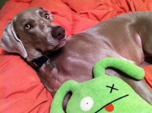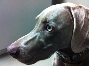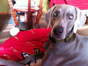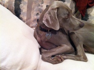 In dogs, humor, lifestyle, pets, weimaraners, writing on 01/14/2012 at 2:35 pmToday, the plan was to drive down the Parkway to the Jersey shore to visit a boyhood friend of my father’s. I was going to interview him and his wife as part of my genealogical preservation efforts. This couple is but one of a handful of people still living who knew both my parents (now deceased) and whom I myself have memories of when our families got together over the years. I had planned on taking Olive with me as I take her everywhere that she is welcome. However, the trip had to be postponed as Olive is recovering from two days of atomic diarrhea. There was no way I was going to leave her at home crated for up to 8 hours under these conditions. Not for her safety and because I didn’t feel like turning her crate and the finished basement into a monochromatic Jackson Pollack painting. I also didn’t think it was fair to take a dog suffering from explosive bouts of diarrhea to someone else’s house. I mean, how do you apologize for that. “I’M REALLY SORRY SHE SPRAYED YOUR COUCH. DO YOU HAVE ANY BLEACH?” Besides, it would be a new experience for Olive and therefore, even a bit stressful for her which was the last thing she needed. It started on late Thursday afternoon, when Olive assumes the familiar “poop-crouch.” As she starts to push, it sounds like an explosion detonates. Neither of us expected this and Olive is so startled by the sound alone, that she jumps up, does a 180, and looks behind her as if to say “WHAT THE HELL WAS THAT AND WHERE DID IT COME FROM?” Really, if it wasn’t so pitiful, I would have laughed out loud. This happens again and again and while I am monitoring her for signs of dehydration, I am getting a little freaked out because it just deteriorates to the point that when she crouches, it looks like a garden hose spraying mud. What now, I think? This dog has a digestive system that is as sensitive as an exposed nerve. There is no apparent thread of consistency between situations when Olive experiences these episodes, which makes it just maddening. On Friday we go to the vet who admires my deftness in securing a non-contaminated sample of the diarrhea in a disposable plastic mealsaver. “ IT ACTUALLY WASN’T SO HARD TO GET,” I SAY. “I’M JUST GLAD I DIDN’T GET SPRAYED.” (I suppress the desire to tell her about Olive’s massive series of explosions on the carpeting in the basement yesterday which I still have to RE-clean. The funny thing was, Olive kept going into the two bathrooms just prior. My God, does she think that THIS is where she should go under these circumstances? This dog is so smart it’s scary.) We discuss what it could be affecting Olive, what it probably is, (irritable bowel syndrome) what we can do to help her right now and what next steps we should take. $261 later, my dog has been injected with fluids subcutaneously to keep her from dehydrating, she has three prescriptions for medication (Carafate, Metronidazole and Reglan), and her watered-down stool is being tested for Giardia. Oh, and she has an ultrasound scheduled for Monday morning. That’s $350. If I were someone going to med school for people, I think I’d rethink my career. Veterinary science and petcare doesn’t appear to have been compromised by insurance companies yet. Since I feel so sorry for Olive, and because I want to keep one eye on her, I let her sleep in bed with me last night. I didn’t sleep at all. She seemed to sleep fairly well until about 4am, when she just couldn’t get comfortable no matter how many times she spun around to change position. And now I hear her stomach gurgling like a backed-up sewer pipe. When I finally rise from bed a few hours later, Olive stays uncharacteristically curled up on the bed. I go over to her and kiss the top of her velvety-soft head and her beautiful amber eyes look up at me as if to say. “I’M NOT MOVING.” So, I leave her there and go about my morning rituals. At around 9:30 that morning, the vet calls to check on Olive’s progress and to report that the Giardia test came back negative. That’s a relief. Getting rid of Giardia is like trying to get rid of dandelions. By now, I have administered all three doses of medication to Olive and she actually seems to be feeling a little better. This sounds counter intuitive, but because a weimaraner’s energy level is always at 150 precent, when Olive’s not feeling well, it’s at about 120 percent, so it’s a little difficult to identify listlessness or lethargy. Today as I write this, I’m trying to keep Olive calm and relaxed. It seems to be working. Right now, she’s curled up in her sage-colored Orvis bed in my office and casually sniffing the dry heat being emitted from the electric baseboard heater. Once she gets up, she’ll do what she’s been doing for the last three days; staying so close to me while I’m walking that it’s as if she’s been sewn onto my pants leg. God, I love this dog.