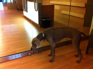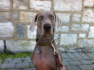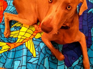 In dogs, humor, lifestyle, pets, weimaraners, writing on 01/28/2012 at 7:56 pmAs I sit here writing this post tonight, Olive is downstairs in the living room, splayed out in front of the pellet stove’s roaring fire and intermittently kvetching. Not a whine, not quite a bark. Something in between. Something meant to communicate her displeasure that I am upstairs and not giving her my full attention. She’s exhausted from the fashion show today. And when she’s tired, she can become quite pissy. If we’re out and it’s past 8pm, she’ll start to piss and moan relentlessly until we leave. She stops only when we get home. She races upstairs, leaps onto the bed like a pole vaulter, executes a few “nesting circles,” then plops down and conks out like a serial drunk. Initially, she lays there curled up like a street vendor’s hot pretzel, ultimately untangling her supermodel-long limbs and stretching out the full length of her frame, squeezing every last molecule of stale air out of her lungs. Occasionally, she might open one eye partially, and catch me staring at her. She goes right back to sleep. Today, at around 10am, we arrived at K-Nine Coaching in Old Lafayette Village for Olive’s fitting. There are already about eight dogs there, most of them the size of an infant’s teaspoon, save for one big-boned boxer who didn’t look very happy to be there. I think he might have felt emasculated by the gigantor bow that was attached to his collar. It was so big it looked like it had sprout from the side of his fawn-colored head like a parasitic twin. Like some “what the Christ were they thinking” accoutrement appended to the cleavage of some Hollywood starlet’s mermaid-like gown. It’s Olive’s turn to be fitted, so she marches forward with her usual unbridled enthusiasm and curiosity. Two dressers are strapping a violet-colored winter coat with a repeating pattern of blue paw prints on it over her head and around her undercarriage. She’s not too crazy about having her head plunged through a small fabric hole, but it’s performed quickly without clumsiness so she doesn’t panic. Meanwhile, she stands there fixated on some small white fluff of a dog wearing pink goggles. “DON’T WORRY OLIVE, YOU WON’T BE WEARING ANYTHING THAT RIDICULOUS. IF YOU’RE GOING TO WEAR ANY GOGGLES, THEY’LL BE PRADA BRAND.” Olive’s friend Luna, a blue weimaraner, arrives. They proceed to act like long-lost Siamese twins separated literally and figuratively for much too long. I know this sounds crazy, but I swear they understand that they are the same breed. Not species, breed. It’s uncanny. Olive behaves differently around Luna, almost as though they came from the same litter (which they did not.) Now it’s time to move Olive to the staging area with the other dogs. We enter an empty storefront which might be 12’ x 10’. It contains dog crates and adjustable fences that would fit properly in a space twice the size. Dogs, dog handlers, dressers and owners are also squeezed into this coffin-like space. Dogs are barking (including my champion barker), dressers are frantically dressing the models, handlers are coming in and out exchanging dogs; it is controlled panic. But this is probably what a human fashion show feels like behind the curtain, I imagine. Meanwhile, I stay close to Olive in her crate because in this atmosphere and because she’s so powerful, I don’t want her accidently escaping in the middle of all this unfocused hysteria. Olive is pissed at me; barking so incessantly that I’m almost getting sprayed by spittle. “I’M RIGHT HERE, OLIVE. KEEP YOUR PANTS ON. IT’S ALMOST YOUR TURN.” Thankfully, finally, it’s Olive’s turn to be led down the runway in the building next door. Flashbulbs pop and I proudly watch my pooch walk down the runway surrounded by strangers ogling her. She loves all the attention. She deplanes from the runway and is returned to my arms. “YOU MEAN I WAITED IN THAT CRATE ALL THIS TIME FOR THIS 90 SECOND WALK? YOU OWE ME,” admonishes Olive. “YEAH, YEAH, YEAH. YOU SEE THAT COAT YOU’RE WEARING? YOU GET TO KEEP IT. WE’RE EVEN.” Olive climbs in the car, lays down across the rear bench seat and sleeps the entire 30-minute ride home. What a rough life this dog has. Now, she’s standing in front of the TV barking at figure skaters doing a dance routine. This is a first. Maybe modeling isn’t challenging enough for her.