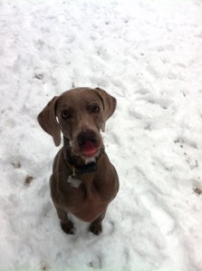 In dogs, humor, lifestyle, pets, weimaraners, writing on 01/21/2012 at 6:57 pmOlive is feeling much better and was thrilled to see the five inches or so of snow we got this bright morning. Although she prefers days where she can lie on her side on the lawn and bake like a hearty Maine potato, she takes great pleasure zipping back and forth through the snow. It makes her so happy, she runs around like a child who just slipped out of their diapers and is racing through the house reveling in their nakedness. Of course, the first thing she does is stop to eat gobs of snow. As much as she can jam into her mouth. She looks like a diabetic who has just uncovered a stash of spice drops and Skittles and tries to devour them before the Nurse takes them away. After she’s done dining on snowballs, she proceeds to use her nose as a plow, shoveling it into all the foot tracks around us—mine and her own. I stand there immobile like a frozen winter scarecrow because if I move, she just “tracks” me across the lawn. She looks up at me and her nose is covered with fresh downy snow. It looks as though she’s been eating powdered donuts. My heart melts when I see this. She looks like a child who has just raised their head from the bowl of ice cream they’ve been eating to reveal a nose covered in chocolate. This tender anthropormorphic moment abruptly ends when Olive breaks into a run and bolts. (This is the outdoor version of how she behaves indoors when she sees one of her little white pills in my hand.) She’s on her flexi-leash but she’s galloping in wide unbroken circles across the lawn again and again. To her, snow is a playmate. In the distance, a dog barks. The wind blows snow through the air like it’s sand. I am freezing because I am still standing in the same spot like a traffic light. I am just happy that Olive is feeling better and enjoying this moment. Crystals of snow have formed on her whiskers and her chin, accentuating their definition. “HEY OLIVE. ARE YOU AWARE THAT RIGHT NOW YOU LOOK LIKE AN OLD BAVARIAN GRANDMOTHER?” As if to punctuate my sentence, Olive immediately squats and pees.