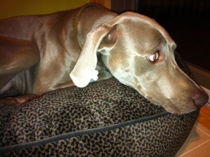 In dogs, humor, lifestyle, pets, weimaraners, writing on 01/18/2012 at 8:28 pmAs I sit here writing tonight, Olive is curled up like a 24-week old fetus on her brand new Bowser bed in the kitchen. She just came in here a few moments ago to check on me. Seeing that I was safe and had not been abducted by neighborhood vermin, she returned to her new “chocolate bones” microfiber bed. When I purchased this item at Well Bred Pet Store, the owner expressed surprise that I was getting a medium-sized bed for my weimaraner. “OH, THIS ISN’T HER REAL BED,” I say. “THIS IS JUST HER RESTING BED. IT’S SORT OF A COMFORTABLE WEIGH STATION WHILE I’M IN THE KITCHEN.” When I selected this bed, I wanted a fabric that was soft, a little fun or contemporary, wouldn’t clash with the new rug I want to get for the kitchen and was not too big. Well, three out of four isn’t so bad. I get the bed home and drop it in the corner of the kitchen and the thing is as big as a flying saucer. Twelve-hundred people could climb aboard and escape to the moon on it. Then, Olive climbs up on it, ready to sit down, but her legs are as unsteady as a drunken sailor’s. I don’t know what the hell is inside this bed, but it gives the impression that it’s an inflatable. It doesn’t really “give” that much. This is totally unacceptable to Olive. She now races around in a thousand circles this way and that trying to flatten her new “nest.” When this doesn’t work, she starts to maniacally scratch at it with her front paws as though she is digging to the earth’s core trying to find an earring she dropped in the bathroom sink. And then, finally, she gives up and just plops down. And now, I can’t get her up from it. This dog is a riddle wrapped in an enigma and cloaked by a sphinx.