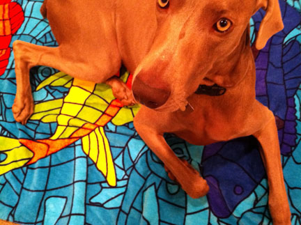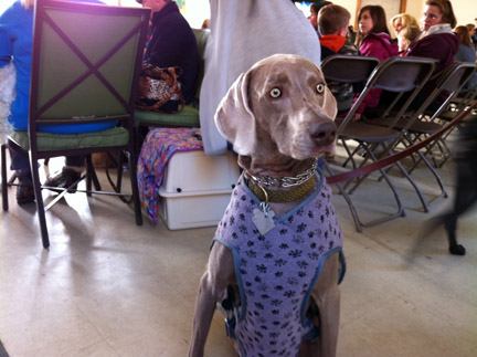 In dogs, humor, lifestyle, pets, weimaraners, writing on 01/28/2012 at 7:56 pmAs I sit here writing this post tonight, Olive is downstairs in the living room, splayed out in front of the pellet stove’s roaring fire and intermittently kvetching. Not a whine, not quite a bark. Something in between. Something meant to communicate her displeasure that I am upstairs and not giving her my full attention. She’s exhausted from the fashion show today. And when she’s tired, she can become quite pissy. If we’re out and it’s past 8pm, she’ll start to piss and moan relentlessly until we leave. She stops only when we get home. She races upstairs, leaps onto the bed like a pole vaulter, executes a few “nesting circles,” then plops down and conks out like a serial drunk. Initially, she lays there curled up like a street vendor’s hot pretzel, ultimately untangling her supermodel-long limbs and stretching out the full length of her frame, squeezing every last molecule of stale air out of her lungs. Occasionally, she might open one eye partially, and catch me staring at her. She goes right back to sleep. Today, at around 10am, we arrived at K-Nine Coaching in Old Lafayette Village for Olive’s fitting. There are already about eight dogs there, most of them the size of an infant’s teaspoon, save for one big-boned boxer who didn’t look very happy to be there. I think he might have felt emasculated by the gigantor bow that was attached to his collar. It was so big it looked like it had sprout from the side of his fawn-colored head like a parasitic twin. Like some “what the Christ were they thinking” accoutrement appended to the cleavage of some Hollywood starlet’s mermaid-like gown. It’s Olive’s turn to be fitted, so she marches forward with her usual unbridled enthusiasm and curiosity. Two dressers are strapping a violet-colored winter coat with a repeating pattern of blue paw prints on it over her head and around her undercarriage. She’s not too crazy about having her head plunged through a small fabric hole, but it’s performed quickly without clumsiness so she doesn’t panic. Meanwhile, she stands there fixated on some small white fluff of a dog wearing pink goggles. “DON’T WORRY OLIVE, YOU WON’T BE WEARING ANYTHING THAT RIDICULOUS. IF YOU’RE GOING TO WEAR ANY GOGGLES, THEY’LL BE PRADA BRAND.” Olive’s friend Luna, a blue weimaraner, arrives. They proceed to act like long-lost Siamese twins separated literally and figuratively for much too long. I know this sounds crazy, but I swear they understand that they are the same breed. Not species, breed. It’s uncanny. Olive behaves differently around Luna, almost as though they came from the same litter (which they did not.) Now it’s time to move Olive to the staging area with the other dogs. We enter an empty storefront which might be 12’ x 10’. It contains dog crates and adjustable fences that would fit properly in a space twice the size. Dogs, dog handlers, dressers and owners are also squeezed into this coffin-like space. Dogs are barking (including my champion barker), dressers are frantically dressing the models, handlers are coming in and out exchanging dogs; it is controlled panic. But this is probably what a human fashion show feels like behind the curtain, I imagine. Meanwhile, I stay close to Olive in her crate because in this atmosphere and because she’s so powerful, I don’t want her accidently escaping in the middle of all this unfocused hysteria. Olive is pissed at me; barking so incessantly that I’m almost getting sprayed by spittle. “I’M RIGHT HERE, OLIVE. KEEP YOUR PANTS ON. IT’S ALMOST YOUR TURN.” Thankfully, finally, it’s Olive’s turn to be led down the runway in the building next door. Flashbulbs pop and I proudly watch my pooch walk down the runway surrounded by strangers ogling her. She loves all the attention. She deplanes from the runway and is returned to my arms. “YOU MEAN I WAITED IN THAT CRATE ALL THIS TIME FOR THIS 90 SECOND WALK? YOU OWE ME,” admonishes Olive. “YEAH, YEAH, YEAH. YOU SEE THAT COAT YOU’RE WEARING? YOU GET TO KEEP IT. WE’RE EVEN.” Olive climbs in the car, lays down across the rear bench seat and sleeps the entire 30-minute ride home. What a rough life this dog has. Now, she’s standing in front of the TV barking at figure skaters doing a dance routine. This is a first. Maybe modeling isn’t challenging enough for her.