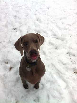 In dogs, humor, lifestyle, pets, weimaraners, writing on 01/21/2012 at 6:57 pmOlive is feeling much better and was thrilled to see the five inches or so of snow we got this bright morning. Although she prefers days where she can lie on her side on the lawn and bake like a hearty Maine potato, she takes great pleasure zipping back and forth through the snow. It makes her so happy, she runs around like a child who just slipped out of their diapers and is racing through the house reveling in their nakedness. Of course, the first thing she does is stop to eat gobs of snow. As much as she can jam into her mouth. She looks like a diabetic who has just uncovered a stash of spice drops and Skittles and tries to devour them before the Nurse takes them away. After she’s done dining on snowballs, she proceeds to use her nose as a plow, shoveling it into all the foot tracks around us—mine and her own. I stand there immobile like a frozen winter scarecrow because if I move, she just “tracks” me across the lawn. She looks up at me and her nose is covered with fresh downy snow. It looks as though she’s been eating powdered donuts. My heart melts when I see this. She looks like a child who has just raised their head from the bowl of ice cream they’ve been eating to reveal a nose covered in chocolate. This tender anthropormorphic moment abruptly ends when Olive breaks into a run and bolts. (This is the outdoor version of how she behaves indoors when she sees one of her little white pills in my hand.) She’s on her flexi-leash but she’s galloping in wide unbroken circles across the lawn again and again. To her, snow is a playmate. In the distance, a dog barks. The wind blows snow through the air like it’s sand. I am freezing because I am still standing in the same spot like a traffic light. I am just happy that Olive is feeling better and enjoying this moment. Crystals of snow have formed on her whiskers and her chin, accentuating their definition. “HEY OLIVE. ARE YOU AWARE THAT RIGHT NOW YOU LOOK LIKE AN OLD BAVARIAN GRANDMOTHER?” As if to punctuate my sentence, Olive immediately squats and pees.