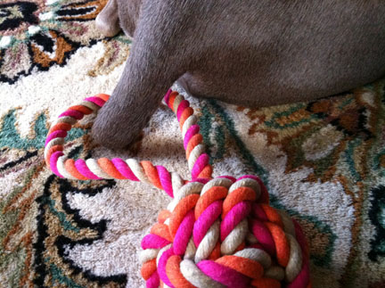 In dogs, humor, lifestyle, pets, weimaraners, writing on 01/11/2012 at 4:42 pmIf it’s not one, it’s the other. As Olive and I jauntily approached the entrance to the dog park last Saturday morning, I spot a Great Dane the size of a thoroughbred trotting around the perimeter of the fence. “NOT GOOD NEWS, OLIVE. THE BIG BLACK BUFFALO IS HERE TODAY.” This means that for Olive’s safety, we have to remain quarantined in the small dog area. Not Olive’s favorite. “Black Buffalo” is one of three Great Danes that visit the park somewhat regularly. One is fawn-colored and the other, a Harlequin Dane. Usually the trio arrive at the same time with their java-junkie owners who remain in a tightly curled clique by themselves. While the Danes appear very friendly, their size (150+ pounds) makes them potentially dangerous to other dogs. Twice now, Olive’s been trampled by two of them, spinning end over end with dirt and pebbles flying, yipping throughout the ugly collision which seems to occur in agonizing slow-motion. It makes me mental to watch. It’s like watching an 18-wheeler roll over a sedan. While I understand there was no aggression involved, my dog could have been hurt and it seemed that only luck prevented her from being injured. It’s hard not be angry at the Danes and yet you can’t blame them. Clearly, the wreck was unintentional. In fact, I kind of like the Danes; they have better manners than their owners who never stop to ask, “Is your dog alright?” Now, flash forward 24 hours. Olive and I are at the dog park on Sunday morning enjoying the bright winter’s day and the company of the other medium-sized dogs and their owners. After about 45 minutes, a woman shows up with a 7-month old ball of black fur that was so small, it looked like a fleece dog toy without stuffing. ‘HOLY CHRIST. ARE YOU KIDDING? SHE’S BRINGING THAT TINY SOCK IN HERE?” I mutter mostly to myself. “Tiny” comes bounding in and to her credit seems completely non-plussed by all the much larger dogs surrounding her, lining up for turns to sniff her naughty bits. However, my dog seems unusually fixated on this ball of fluff and while Olive does not have an aggressive temperament at all, she is by breed, a hunter of small animals and has a “strong, instinctive prey drive.” People desiring to own a weimaraner are cautioned in skyscraper-size type that weims may “tolerate” cats but many may “chase and kill small animals.” As I watch Olive routinely attempt to place her mouth around Tiny’s microscopic neck, I figure I better intervene before my dog starts shaking it by the neck as though it’s a toy. That would not be good. So I grab Olive by the collar, who is desperately trying to resist my attempt to leash her, and say, ”THAT’S IT OLIVE. WE’RE DONE FOR TODAY. THE LAST THING WE NEED IS FOR YOU TO COMMIT A HOMICIDE IN BROAD DAYLIGHT.”