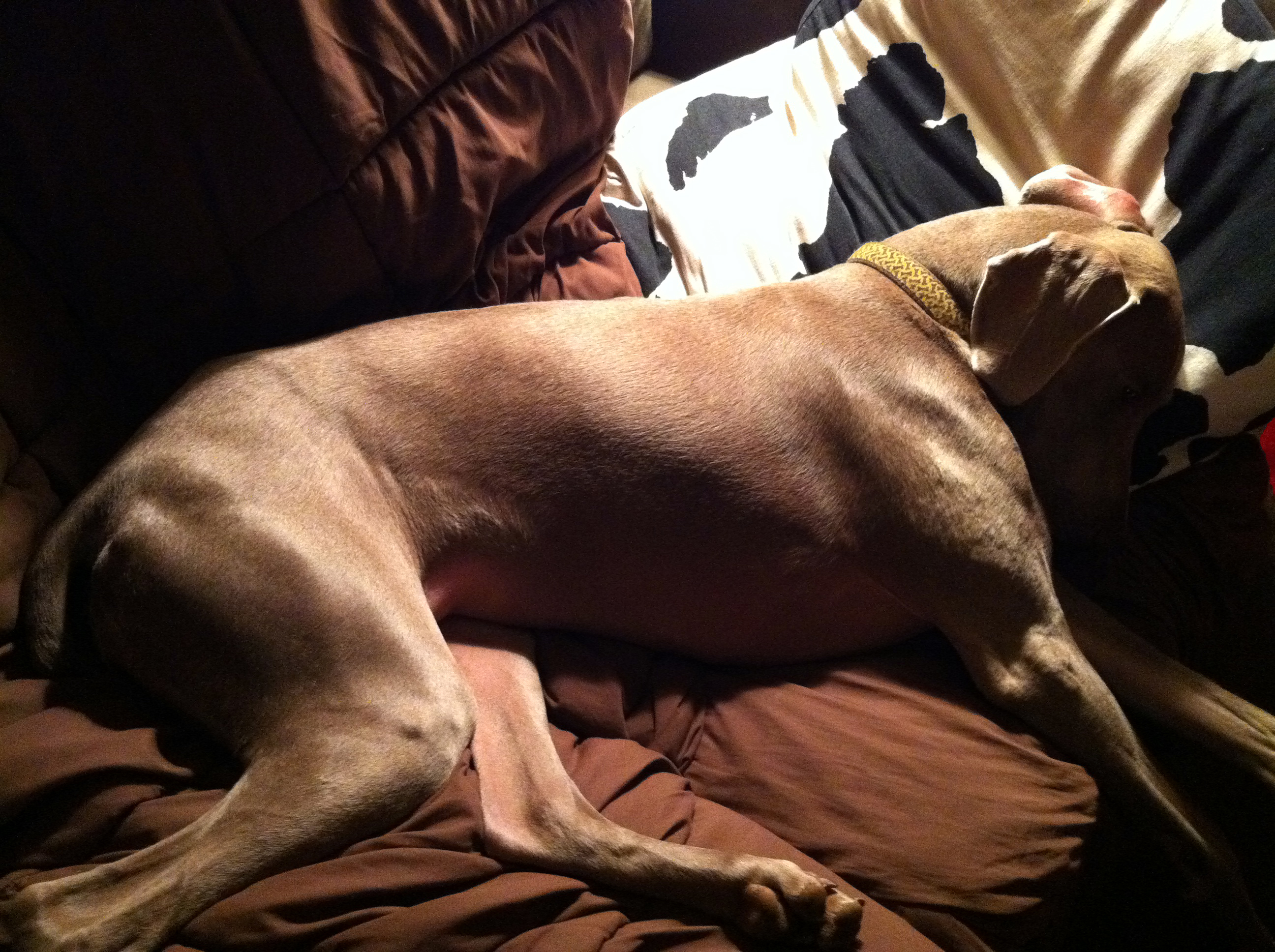 In dogs, humor, lifestyle, pets, weimaraners, writing on 01/18/2012 at 8:28 pmAs I sit here writing tonight, Olive is curled up like a 24-week old fetus on her brand new Bowser bed in the kitchen. She just came in here a few moments ago to check on me. Seeing that I was safe and had not been abducted by neighborhood vermin, she returned to her new “chocolate bones” microfiber bed. When I purchased this item at Well Bred Pet Store, the owner expressed surprise that I was getting a medium-sized bed for my weimaraner. “OH, THIS ISN’T HER REAL BED,” I say. “THIS IS JUST HER RESTING BED. IT’S SORT OF A COMFORTABLE WEIGH STATION WHILE I’M IN THE KITCHEN.” When I selected this bed, I wanted a fabric that was soft, a little fun or contemporary, wouldn’t clash with the new rug I want to get for the kitchen and was not too big. Well, three out of four isn’t so bad. I get the bed home and drop it in the corner of the kitchen and the thing is as big as a flying saucer. Twelve-hundred people could climb aboard and escape to the moon on it. Then, Olive climbs up on it, ready to sit down, but her legs are as unsteady as a drunken sailor’s. I don’t know what the hell is inside this bed, but it gives the impression that it’s an inflatable. It doesn’t really “give” that much. This is totally unacceptable to Olive. She now races around in a thousand circles this way and that trying to flatten her new “nest.” When this doesn’t work, she starts to maniacally scratch at it with her front paws as though she is digging to the earth’s core trying to find an earring she dropped in the bathroom sink. And then, finally, she gives up and just plops down. And now, I can’t get her up from it. This dog is a riddle wrapped in an enigma and cloaked by a sphinx.