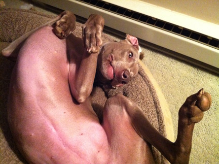 In dogs, humor, lifestyle, pets, weimaraners, writing on 01/14/2012 at 2:35 pmToday, the plan was to drive down the Parkway to the Jersey shore to visit a boyhood friend of my father’s. I was going to interview him and his wife as part of my genealogical preservation efforts. This couple is but one of a handful of people still living who knew both my parents (now deceased) and whom I myself have memories of when our families got together over the years. I had planned on taking Olive with me as I take her everywhere that she is welcome. However, the trip had to be postponed as Olive is recovering from two days of atomic diarrhea. There was no way I was going to leave her at home crated for up to 8 hours under these conditions. Not for her safety and because I didn’t feel like turning her crate and the finished basement into a monochromatic Jackson Pollack painting. I also didn’t think it was fair to take a dog suffering from explosive bouts of diarrhea to someone else’s house. I mean, how do you apologize for that. “I’M REALLY SORRY SHE SPRAYED YOUR COUCH. DO YOU HAVE ANY BLEACH?” Besides, it would be a new experience for Olive and therefore, even a bit stressful for her which was the last thing she needed. It started on late Thursday afternoon, when Olive assumes the familiar “poop-crouch.” As she starts to push, it sounds like an explosion detonates. Neither of us expected this and Olive is so startled by the sound alone, that she jumps up, does a 180, and looks behind her as if to say “WHAT THE HELL WAS THAT AND WHERE DID IT COME FROM?” Really, if it wasn’t so pitiful, I would have laughed out loud. This happens again and again and while I am monitoring her for signs of dehydration, I am getting a little freaked out because it just deteriorates to the point that when she crouches, it looks like a garden hose spraying mud. What now, I think? This dog has a digestive system that is as sensitive as an exposed nerve. There is no apparent thread of consistency between situations when Olive experiences these episodes, which makes it just maddening. On Friday we go to the vet who admires my deftness in securing a non-contaminated sample of the diarrhea in a disposable plastic mealsaver. “ IT ACTUALLY WASN’T SO HARD TO GET,” I SAY. “I’M JUST GLAD I DIDN’T GET SPRAYED.” (I suppress the desire to tell her about Olive’s massive series of explosions on the carpeting in the basement yesterday which I still have to RE-clean. The funny thing was, Olive kept going into the two bathrooms just prior. My God, does she think that THIS is where she should go under these circumstances? This dog is so smart it’s scary.) We discuss what it could be affecting Olive, what it probably is, (irritable bowel syndrome) what we can do to help her right now and what next steps we should take. $261 later, my dog has been injected with fluids subcutaneously to keep her from dehydrating, she has three prescriptions for medication (Carafate, Metronidazole and Reglan), and her watered-down stool is being tested for Giardia. Oh, and she has an ultrasound scheduled for Monday morning. That’s $350. If I were someone going to med school for people, I think I’d rethink my career. Veterinary science and petcare doesn’t appear to have been compromised by insurance companies yet. Since I feel so sorry for Olive, and because I want to keep one eye on her, I let her sleep in bed with me last night. I didn’t sleep at all. She seemed to sleep fairly well until about 4am, when she just couldn’t get comfortable no matter how many times she spun around to change position. And now I hear her stomach gurgling like a backed-up sewer pipe. When I finally rise from bed a few hours later, Olive stays uncharacteristically curled up on the bed. I go over to her and kiss the top of her velvety-soft head and her beautiful amber eyes look up at me as if to say. “I’M NOT MOVING.” So, I leave her there and go about my morning rituals. At around 9:30 that morning, the vet calls to check on Olive’s progress and to report that the Giardia test came back negative. That’s a relief. Getting rid of Giardia is like trying to get rid of dandelions. By now, I have administered all three doses of medication to Olive and she actually seems to be feeling a little better. This sounds counter intuitive, but because a weimaraner’s energy level is always at 150 precent, when Olive’s not feeling well, it’s at about 120 percent, so it’s a little difficult to identify listlessness or lethargy. Today as I write this, I’m trying to keep Olive calm and relaxed. It seems to be working. Right now, she’s curled up in her sage-colored Orvis bed in my office and casually sniffing the dry heat being emitted from the electric baseboard heater. Once she gets up, she’ll do what she’s been doing for the last three days; staying so close to me while I’m walking that it’s as if she’s been sewn onto my pants leg. God, I love this dog.