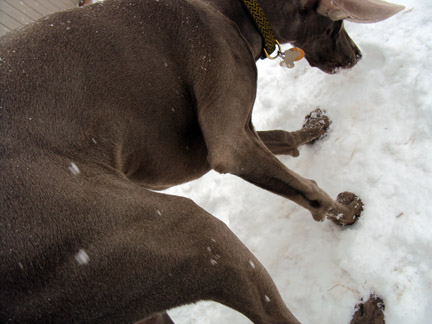 In dogs, humor, lifestyle, pets, weimaraners, writing on 01/23/2012 at 8:23 pmYes, there still are kind people in the world in which we live. On the last leg of our walk yesterday, following a weather pattern that dropped five inches of snow on the ground, Olive starts raising one of her hind legs. As high as the Radio City Rockettes. She’s still walking, but the right rear leg is drawn high up off the sidewalk. I bend down and start rubbing her paw with my gloved hand, brushing the snow from her foot and possibly salt crystals. I am as careful as I can be when walking her in the winter. Mindful of the anti-litigation salt crystals people toss across their sidewalks like chicken feed, I try to steer Olive away from obvious blue clumps and direct her to walk on the snowy lawn. I figure this way, her paws get a brief respite and are possibly somewhat cleansed by the snow. She puts her foot down, walks a few feet, lifts the same leg and then LAYS DOWN IN THE SNOW in obvious discomfort. “Shit,” I mutter. It must be the salt crystals burning her pads. Not thinking, I try to pick her up in my arms so all four feet are off the ground and within seconds I realize that I have to put her back down. What do I think I am, a weight lifter? She’s almost 70 pounds and there’s no way I can really hold her. I might as well try to lift a burlap bag filled with wet cement. As I’m trying to mentally calculate my options, a black SUV rolls to a stop across the street and the driver calls out: “Do you need any help? My dog does that sometimes too.” I reply: “Thanks. I think it must be the salt. We’re OK. We only have another block or two. I think we’ll make it.” “Boy, that was nice, huh Olive?” I pick up both Olive’s back feet and vigorously rub her frosty paws for about 10 seconds. She’s upright now on all dainty fours, but looking at me a little unsure of what to do next. “We don’t have much further to go Olive. Walk on the snow instead of the sidewalk and I promise I’ll rinse your paws off in nice warm water when we get home.” She seems to instinctively trust me or figures she has no other choice because English is not her first language. We continue on our walk, me on my two feet, her on all four of hers. When we get into the car and I turn the key in the ignition, I notice that the temperature is just 21 paw-chilling degrees. Yikes. I realize it was probably just the cold that was flash freezing Olive’s pads. This happened once or twice last year during her first winter. In case you’re wondering, I did ask the vet about possibly getting booties for Olive and he said not to baby her. (Who me?) She’s a dog, her feet have to get used to it. Now, if I could only find where I put the container of Musher’s Secret I bought for Olive this past Summer. I can only imagine that trying to apply it to her paws will be like trying to apply it to the heels of an acrobat.