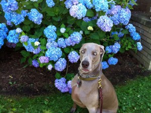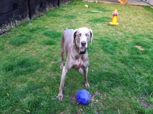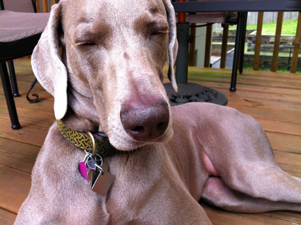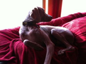 In dogs, humor, lifestyle, pets, weimaraners, writing on 06/09/2012 at 8:49 pmOlive has been in training the past few days for her AKC Good Canine Citizen Test next weekend. Which means that I’ve spent what seems like hours (and it’s only minutes) each day putting Olive (and myself) though a series of repetitive tasks. For someone like myself who detests routine, this is absolutely mind-numbing. I’d rather set my hair on fire. But I don’t want to fail Olive and if she doesn’t pass, it won’t be her fault, it will be mine. She is very well-behaved, but remains highly spirited. I feel pretty good about her ability to pass most of the requirements. Except for one. Since she is uber-friendly and wears her heart on her sleeve, greeting a stranger while remaining in a “sit” is going to be challenging for her. Weimaraners adore people. To Olive, the world is full of friends whose crotch she hasn’t sniffed yet. Because weimaraners are such complex personalities, I find myself constantly intellectually challenged by her idiosyncrasies. I ask myself, “Should I take her for a walk or run before the test so she’s a bit calmer? Like a Category 2 hurricane instead of a Category 5? Or will that make her too tired and cranky?” I also have to make sure she eats before we leave so she’s not hungry and cranky like an infant awaiting its next warm bottle of milk. But then I also have to make sure I leave enough time so she drops her lawn cigars before we leave. This requires military precision timing. And God forbid she’s thirsty during the test. Because she will bark insistently until she’s given a sparkling clean bowl of filtered water. So I have to make sure the Princess has had a drink with enough time to pee before the test. This is what life is like with a weimaraner. I don’t know who’s more OCD, me or Olive. Maybe that’s why a weimaraner ended up being the perfect dog for me. All I know is that sometimes when I look at her, I can’t believe how lucky I am to have her. Keep your paws crossed Olive. If I can make it through training for the rest of the week, you have a good chance of passing.