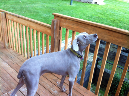 In dogs, humor, lifestyle, pets, weimaraners, writing on 06/09/2012 at 7:59 pmWhile it may look like Olive is communicating telepathically with a UFO overhead, she’s actually bird watching. More precisely, this is what she looks like seconds before she leaps into the air like a trapeze artist in an effort to snatch a hawk flying about 20 feet above her. Goofball dog.