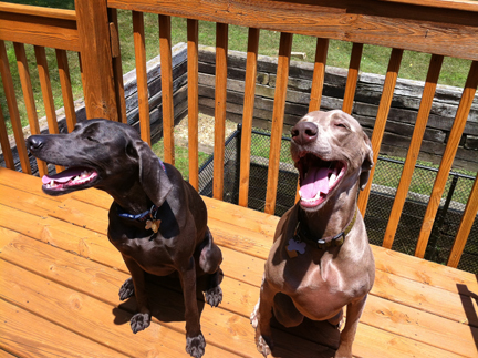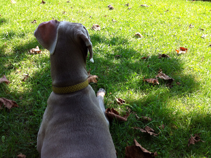 In dogs, humor, lifestyle, pets, weimaraners, writing on 09/02/2012 at 7:19 pmI am a lucky dog. Literally and figuratively. I sit at the feet of my pack leader on this fine Saturday afternoon observing the world around me both four-legged and two. The leaves are falling again. Some may see this as evidence of Summer weeping, but not I. Leaves are simply nature’s way of announcing change. People come and go. Some tall, some tiny. They are a curious bunch. They stop and point at me and say nice things. There is a gentle breeze today. I feel it on the ridges of my ears. It transports a variety of scents that waft past my nose in delicate waves. Yes, this is the life. When humans say, “It’s a dog’s life,” this is what they mean. I live in the present at all times. I don’t worry about what’s ahead and I don’t mourn what’s past me. I sit here, relaxed, in the company of my pack leader, in a state of sublime peacefulness. Unlike my pack leader, I am unburdened by many responsibilities. I have one. To protect my pack leader. It keeps me very focused. At least as focused as I can be. The funny thing about living in the present is that it makes time stop. It allows me to enjoy the smallest moments in my day, one at a time. Maybe that’s why I feel so content. Because instead of each moment rushing by in a blur or stuck somewhere in the past, I experience each moment fully. So, even though our lives do not measure the same number of years as the humans who love and care for us, I think we live our lives more fully. Thank God, I’m a dog.