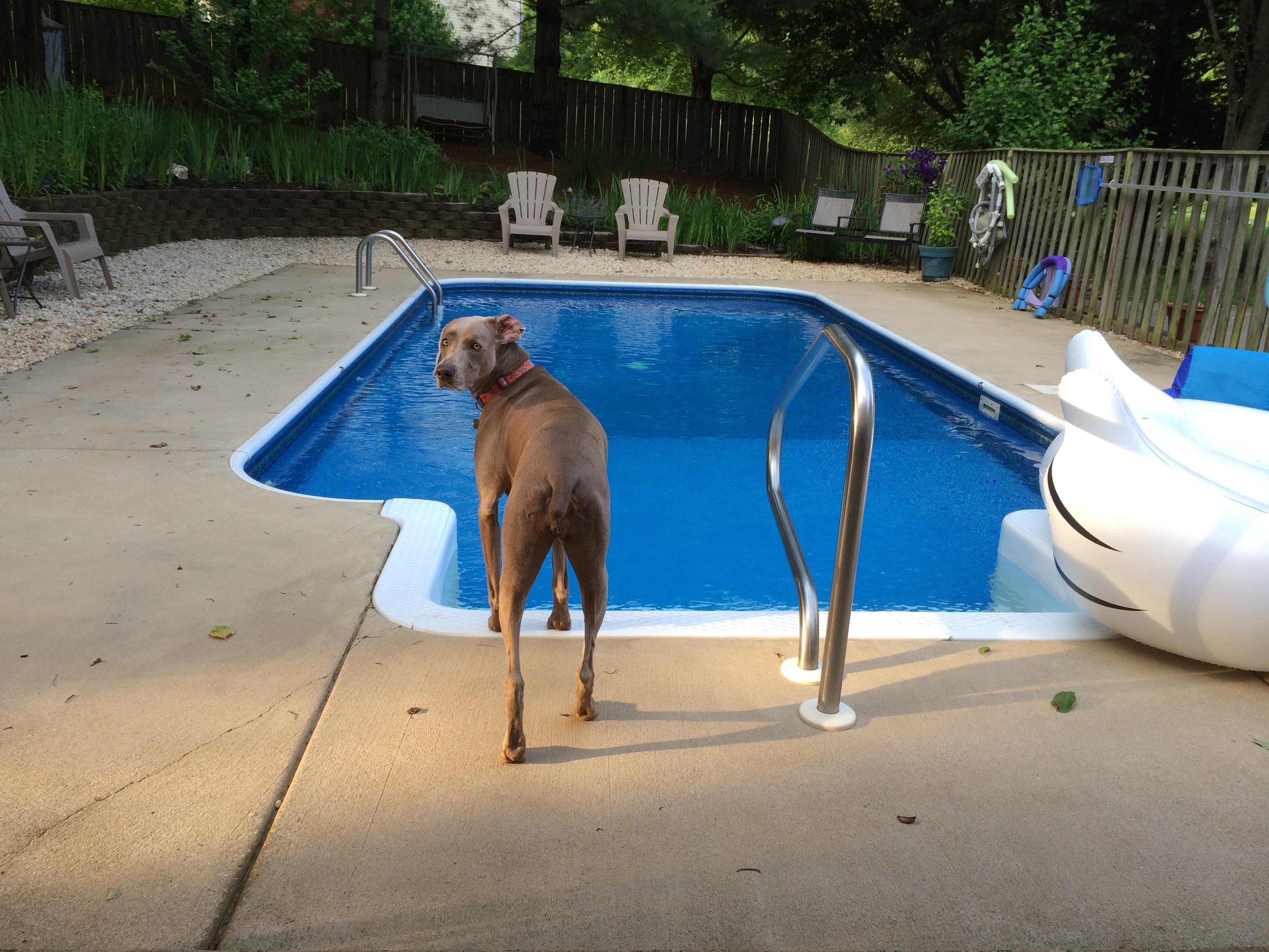 I have tried everything to get this dog into a pool. Mostly so I could teach her how to safely get out of one if she ever fell in. When she was a puppy, I held her gently, walked into my neighbor’s pool, cooing as I walked about with her in my arms. After a few minutes, I’d face the stairs and gently release her where she’d paddle like a crazed kayaker until she got her footing on the stairs. Out she went, shaking herself off repeatedly as though she had been dunked in something too foul for words. There, standing on the concrete, she’d look down at me with her big amber eyes as if to say, “WHAT DID YOU DO THAT FOR?” I did this on about three separate occasions. In hindsight, maybe that wasn’t a good idea. I also tried introducing her to a wading pool. She takes the concept of a wading pool very literally. She will wade into it with all four paws and retrieve her toys which lie at the bottom like sunken battleships, but mostly she will drink out of it. To Olive, any container, no matter how large or small that is filled with water is simply a water bowl for her to drink from. Yes, this means that the toilet seat must be in the down position at all times.
