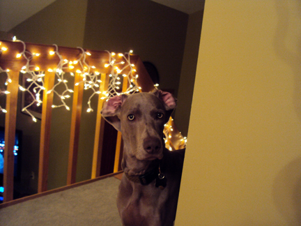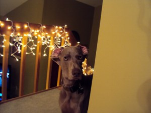 In Uncategorized on 02/05/2011 at 11:21 amOlive seems to be turning into the amazing 50-foot colossal Weim. The kitchen counters no longer interest her. Why bother when you are tall enough to stick your head into the kitchen sink and lick the dirty dishes? Yes, her tongue actually reaches the bottom of the sink. Sitting at the kitchen table, looking at Olive from behind, it appears that there is a very tall brown-grey person (with long ears and very skinny legs) standing at the kitchen sink doing the dishes. I think, “What is Ghandi doing in my kitchen?” The only time Olive’s head pops up as fast as a champagne cork being released is when a) she sees my neighbor’s car going down the driveway or b) she hears a broken record going “NO, NO, NO, NO, NO, OFF, OFF, OFF, OFF!” Sometimes, she gets down a little too casually, like a 5 year-old being told to ‘PUT DOWN THAT LOLLIPOP NOW!” and complying very reluctantly.