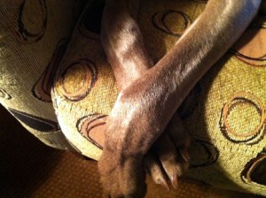 In dogs, humor, lifestyle, pets, weimaraners, writing on 08/28/2011 at 8:10 pmWell, Olive’s prayers must have worked. Hurricane Irene left Northwestern New Jersey relatively unscathed…so far. Although most of the rivers will crest many feet above flood stage by Tuesday morning. Olive and I slept on the extra-long microfiber couch in the living room last night. I didn’t want us to sleep in either the master or guest bedrooms upstairs in case a tree fell on the house. These rooms would take the brunt of the fall and I didn’t feel like waking up (maybe) pinned beneath the trunk of a soaking wet black walnut tree. For Olive, it was out of the ordinary to be sleeping outside her crate in the bedroom. First, she curled up like a little donut in the upholstered chair in the corner of the living room. Why this dog insists on circling her sleeping spot 25 to 30 times in rapid succession before dropping her legs beneath her is beyond me. It’s like watching the canine version of the fable, “The Princess and The Pea.” She stays there for 20 minutes which probably seems like two days to her. Then, at around 11:30pm, as if Jack Kerouac has been reincarnated, she gets up to aimlessly explore her other options. I see Olive’s “second wind” coming so I immediately get up and yank her fire engine-red Orvis donut bed off the top of her crate and place it flush against the couch I’m lying on. After she circles this expensive nest 25 times, she lays down and I say “GOOD GIRL OLIVE. GO NIGHT NIGHT.” Within seconds, she reveals her true intent. She jams as much of the fleece-like edging into her mouth and starts sawing away. ‘OLIVE. STOP IT. YOU ALREADY RUINED ONE BED.” I guide her back to the overstuffed chair and she climbs up and settles herself into the wide seat snugly, draping her head over its arm. Now I’m thinking, “WHERE THE HELL IS THIS STORM? NOTHING’S HAPPENING.” As if I had asked this of Zeus face-to-face, the response is immediate. The rain that comes down could only be described as a sustained assault. It is LOUD and POWERFUL. As it hits the roof of my wood-framed contemporary home with cathedral ceilings, the sound is somehow amplified. It has the distinct rhythm of a machine gun but the noise it makes sounds more like “BAM BAM BAM BAM BAM BAM BAM BAM.” This continues throughout the night uninterrupted. Sometimes softer, sometimes louder. I see Olive faintly, bathed in the blue glow of the oversize digital clock below the TV. She raises her head and looks around the room whenever the sound gets louder. The look on her face says it all. ‘WHAT THE HELL IS THAT?”At around 2am, I’m still mostly awake. I watch Olive rise from the chair and saunter over to the couch near me. I gently pull her up and she hops on the couch. She sidles next to me, extending her lengthy frame against the back of the couch. I put my arm around her and close my eyes, knowing that as long as Olive and I are okay, we can deal with whatever comes our way.