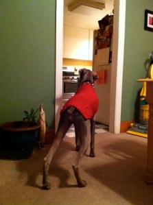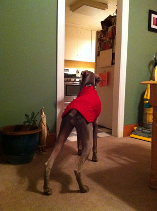 In dogs, humor, lifestyle, pets, weimaraners, writing on 12/20/2011 at 9:46 amKnock. Knock. Who’s there? It’s Olive. Olive who? Olive food. This dog is so alert, she can detect a fly fart. (By sound and scent). Olive loves going over to Susie and Perry’s because Susie will rough house with her and Olive gets to sniff up three-year old Ryan. But everything in the universe comes to an apocalyptic halt when Olive smells food or observes activity in THE KITCHEN. The room that brings her the greatest joy in life. Counter tops lined with food in various stages of preparation. Scents that delight Olive’s over-stimulated nostrils; sending her into a heightened state of ecstasy. ‘WHERE SHOULD I JUMP FIRST,” thinks Olive. To Olive, it must appear that it is a buffet created just for her. ‘GET OUT OF THE KITCHEN,” I command Olive as she is craning her long graceful neck over the sink to lick the grease off a pan. She willfully continues until I march over there, grab her by the collar and pull her away. I’ve tried a zillion different things. Nothing has the magnetic pull required to chase her away from oily grease and carcass niblets stuck to a cold frying pan. She really has to be guided out of the kitchen and then she watches me like she’s Bernie Madoff sizing up his next mark. Because in the nanosecond that I turn my head away from her, she quietly but whiplash-rapidly tracks back to the “edible amusement park.” Whenever my intelligent pooch is confronted with a situation that she realizes may result in a correction, she very slyly and daintily makes her move, as though being delicate makes the behavior acceptable. Even this makes me laugh. “OLIVE. ARE YOU FREAKIN’ KIDDING ME? GET OUT OF THE KITCHEN. I DON’T CARE HOW CUTE AND GRACEFUL YOU ARE.” Everyday is a battle of wits with a weimaraner. Some days I win, some days I lose, but I wouldn’t trade it for anything. In fact, the other day, I came to realize that after having a weim, I don’t think I could ever have any other kind of dog again. This dog keeps me on my toes. And living with a weimaraner? They’re four-legged soul mates. It’s like living with a human who actually loves you unconditionally and doesn’t talk. What an excellent combination.