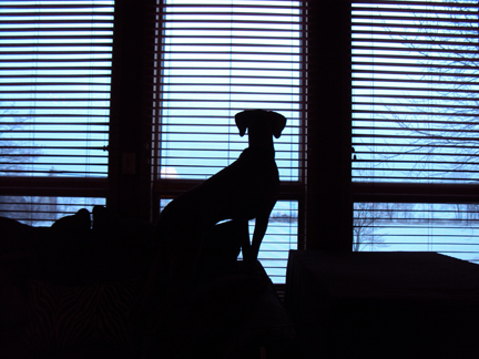 In Uncategorized on 02/05/2011 at 11:21 amOlive seems to be turning into the amazing 50-foot colossal Weim. The kitchen counters no longer interest her. Why bother when you are tall enough to stick your head into the kitchen sink and lick the dirty dishes? Yes, her tongue actually reaches the bottom of the sink. Sitting at the kitchen table, looking at Olive from behind, it appears that there is a very tall brown-grey person (with long ears and very skinny legs) standing at the kitchen sink doing the dishes. I think, “What is Ghandi doing in my kitchen?” The only time Olive’s head pops up as fast as a champagne cork being released is when a) she sees my neighbor’s car going down the driveway or b) she hears a broken record going “NO, NO, NO, NO, NO, OFF, OFF, OFF, OFF!” Sometimes, she gets down a little too casually, like a 5 year-old being told to ‘PUT DOWN THAT LOLLIPOP NOW!” and complying very reluctantly.