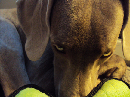 In weimaraners on 03/07/2011 at 5:47 pmDo you have any idea how difficult it is to render routine personal care to an 11-month old Weimaraner by yourself? Once again, I had to wrestle Olive to the ground pinning her like a State Wrestling Champion just to squeeze two lousy drops of medicine into her left eye because she has conjunctivitis. The treatment started out fine. I guess the first time she didn’t know what was coming so she stared at me doe-eyed like Bambi which allowed me to perform this minor medical procedure with ease. The second time, she tolerated it. The third time, she gave me the paw. Ever since then, I have to chase her around the house like I’m chasing a greased piglet. I catch her and she starts squirming like she’s boneless, eventually escaping my grip with Houdini-like flair. For every drop that manages to land in her eye, three run down her muzzle. Thank God the 7-10 day course of treatment is almost over. I’ve tried being calm and soothing when I first approach her but she’s not stupid. She knows what’s coming. And she’d simply… rather not, thank you. I guess it just takes practice. I finally figured out how to clean her ears without as much fuss. The secret? Soak the cotton ball in witch hazel and put it into her ear further than you wanted your finger to go and do it with confidence. Hesitate for a nanosecond, and Olive will know she’s being violated by an amateur. Then, it’s over. (And if you have a Weim, don’t let them see the bottle of witch hazel because they can read. Where did THAT name come from anyway?) I just wish I could remove her nails, clip them and then insert them back into her paws. This would be much easier. Thank God she doesn’t have hemorrhoids.